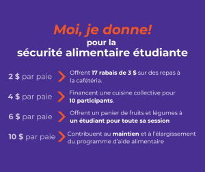 - Offrir plus de dépannage alimentaire et contribuer à la bibliothèque alimentaire de l’Association générale étudiante
