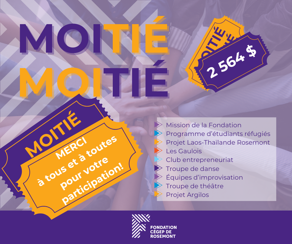 La Fondation du Cégep à Rosemont est fière d’annoncer la répartition des 2 564 $ récoltés lors de notre 2 ième moitié-moitié, grâce à votre générosité.