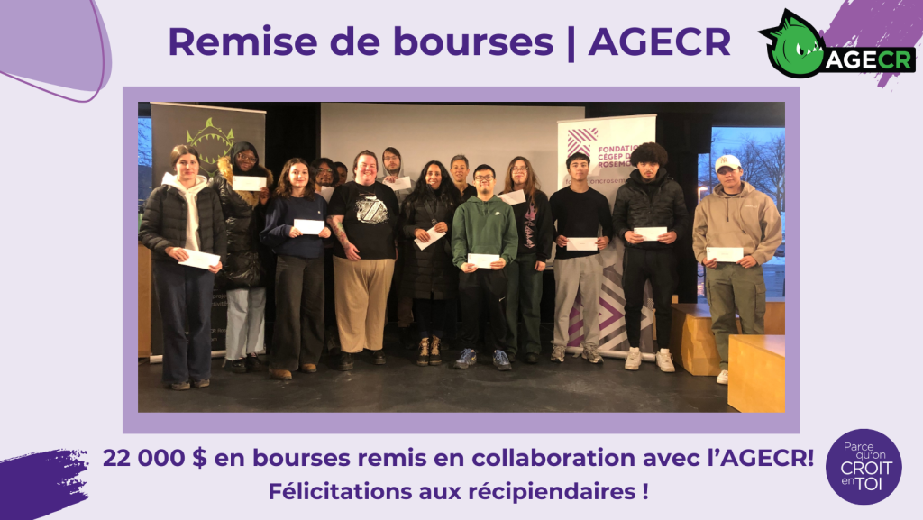 La Fondation, en collaboration avec l’AGECR, est fière d’avoir remis 62 bourses, pour un total de 17 000 $, afin de soutenir la réussite étudiante