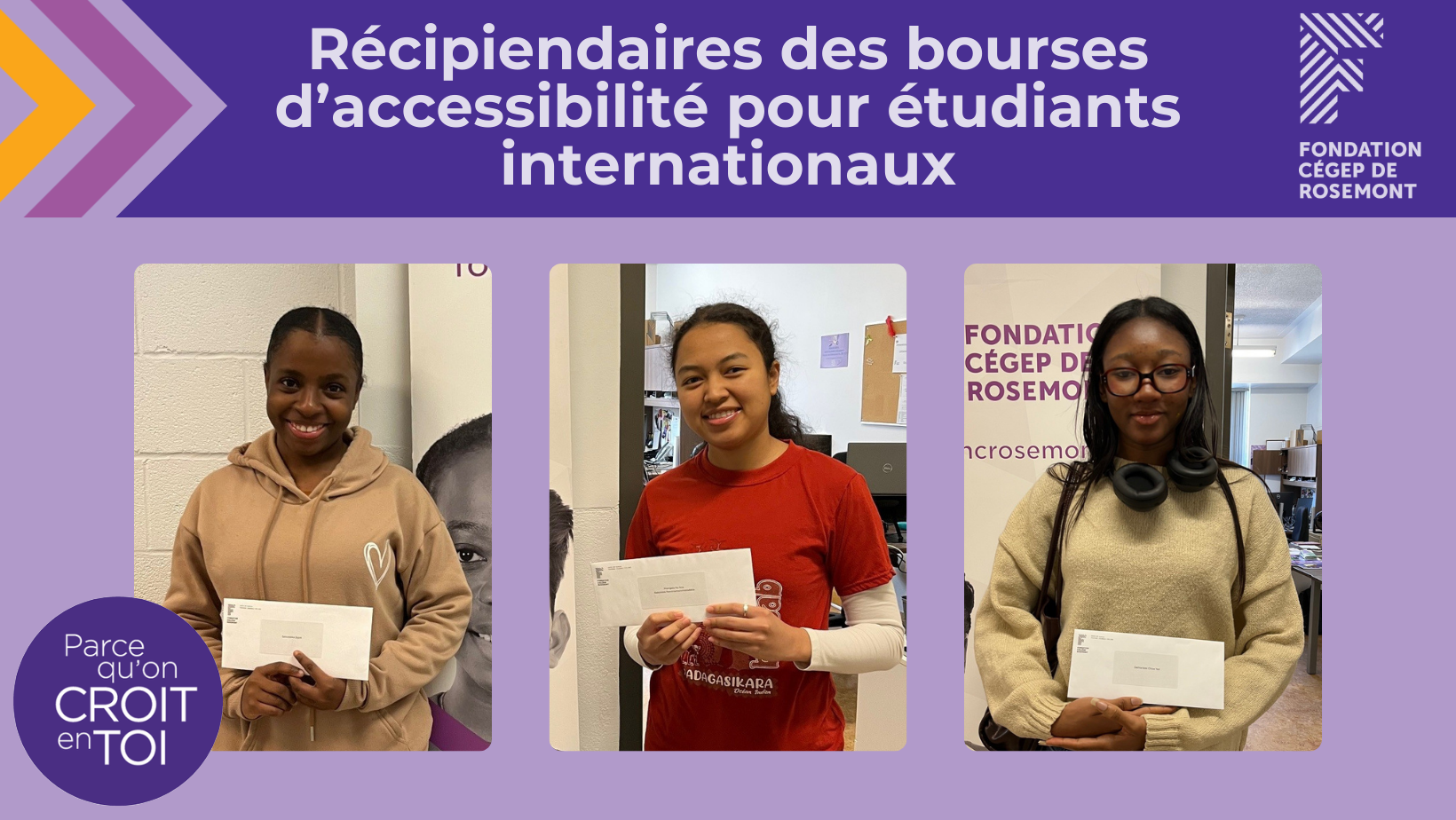 La Fondation du Cégep de Rosemont est fière d’avoir remis quatre bourses d’accessibilité de 500 $ destinées aux étudiants internationaux.