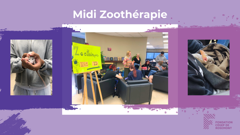 Le 15 septembre dernier, la bibliothèque du Cégep de Rosemont a accueilli une activité de zoothérapie, financée par la Fondation. Étudiant·e·s et membres du cégep ont pu partager un moment de réconfort et de bonheur grâce à la présence d’une zoothérapeute et de ses animaux. 🐾💛